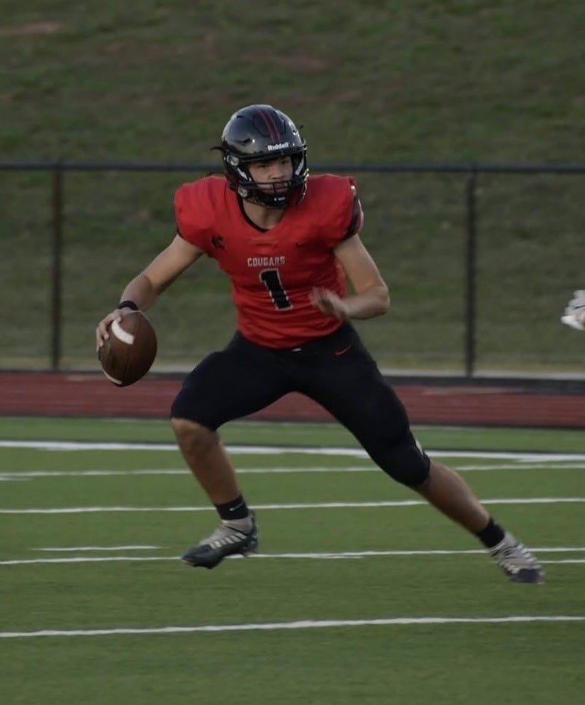 After a promising season was cut short by injury last year, sophomore Ryder Davis is in his second year as the quarterback for the Keys Cougars. He had over 1000 yards of offense when a mid-season injury ended his season last year so he’s on a mission to take up where he left off in 2025. “My start in football came about when I was watching my cousin Nolan Philpott play. I’d go to his games with my aunt, and it made me want to play as well,” said Davis who played baseball and basketball through middle school and says he may go back to basketball this year. “I like the camaraderie of being part of a team and I like the contact of the sport (though maybe not as much after last year).” Even though he’s just a sophomore, as the quarterback the position calls for him to be somewhat of a leader and it’s that camaraderie that helps him do it. “We’ll go to eat before a game or after practice sometimes and hang out a lot and we bond pretty well, and they pretty much listen to me out on the field.” Ryder describes himself as more of a running rather than passing quarterback. “I can throw the ball but that’s an area I’m really working to improve, especially my accuracy as well as being able to read defenses better.” Though he has played some defense, he prefers playing offense. “I just like the feeling of scoring and being able to help determine the outcome of a close game.” And he shared a couple of memories that illustrate that point. “Last year in our season opener against Gore, my first game at QB, it was late in the game, and I rolled out and started to run but spotted Clancey Queton down the field and hit him with a touchdown pass that won the game for us. The very same thing happened the next week against Stillwell, and we went ahead late but ended up losing that game.” In his spare time, Ryder likes to hang out with pals and his girlfriend, play catch with his teammates and play golf.